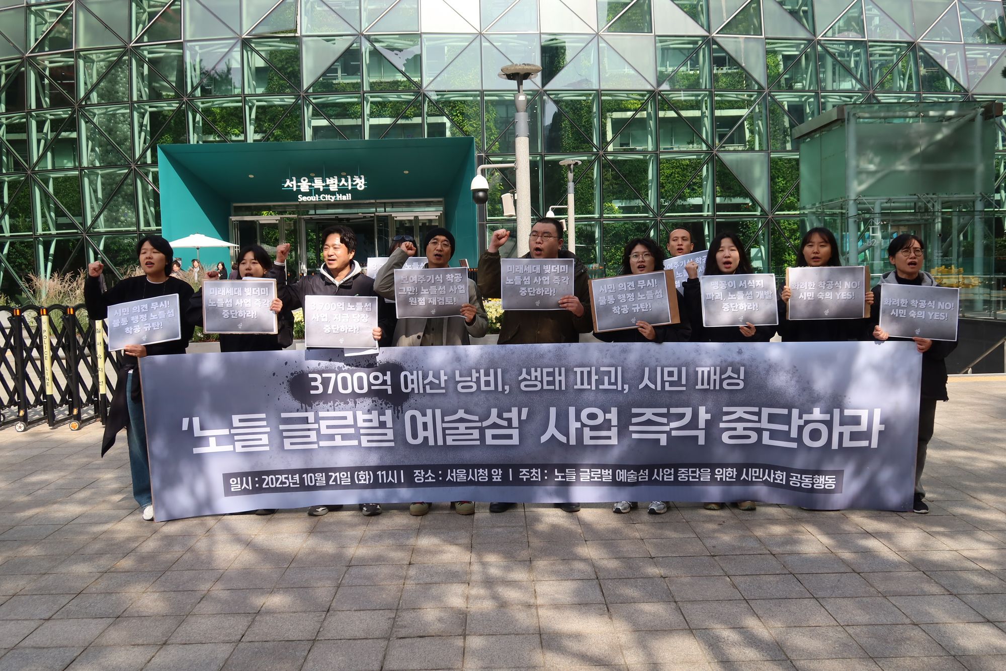 공동행동은 서울시에 ▲‘노들 글로벌 예술섬’ 사업 전면 철회 ▲착공 일정 전면 보류 ▲내년 지방선거를 통한 시민적 판단 절차 마련 등을 요구했다.