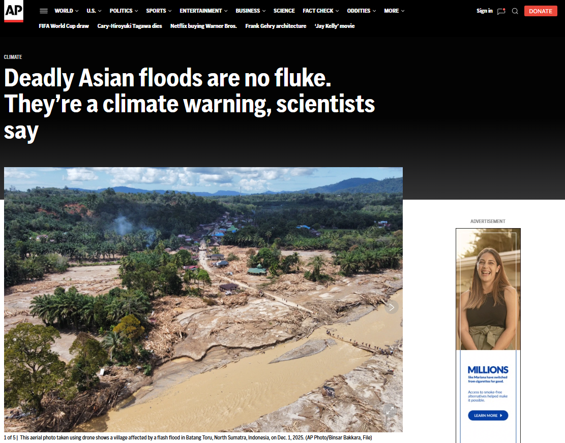 로이터는 특히 인도네시아 수마트라섬의 광산 개발과 불법 벌목이 홍수 피해를 증폭시켰다고 보도하며, “산림 훼손이 빗물을 지면이 흡수하지 못하게 만들어 산사태 위험을 극대화했다”고 전했다. AP는 이에 더해 “라니냐 상황이 습도와 강수량을 높이며 기후변화와 시너지를 일으켰다”고 덧붙였다.