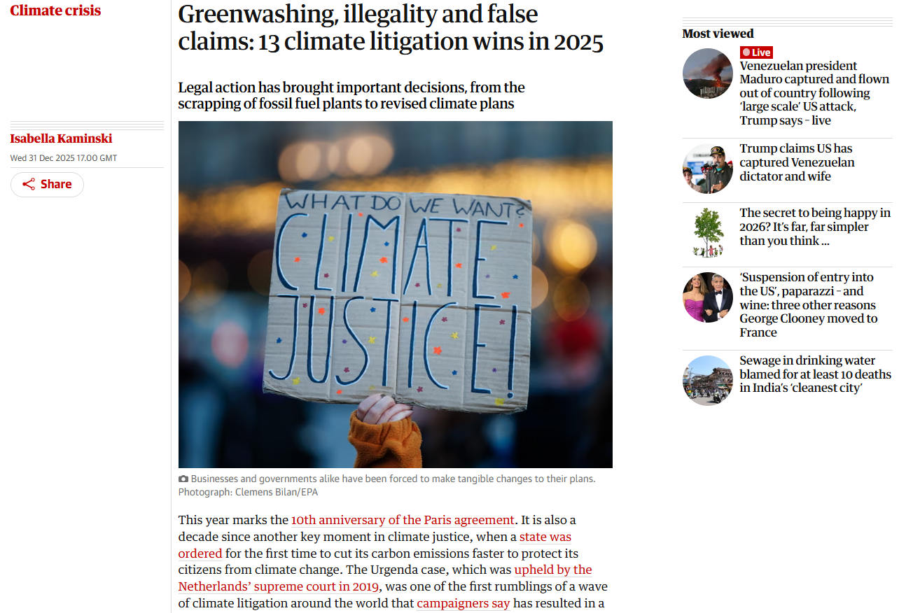 영국 일간지 가디언는 12월 31일 보도에서, 올해 전 세계에서 나온 주요 기후 소송 판결 가운데 13건의 의미 있는 승소 사례를 정리했다. 판결의 공통점은 기업과 정부가 내세운 ‘친환경 주장’이 실제 행동과 일치하지 않을 경우 불법으로 판단될 수 있다는 점을 분명히 했다는 것이다.