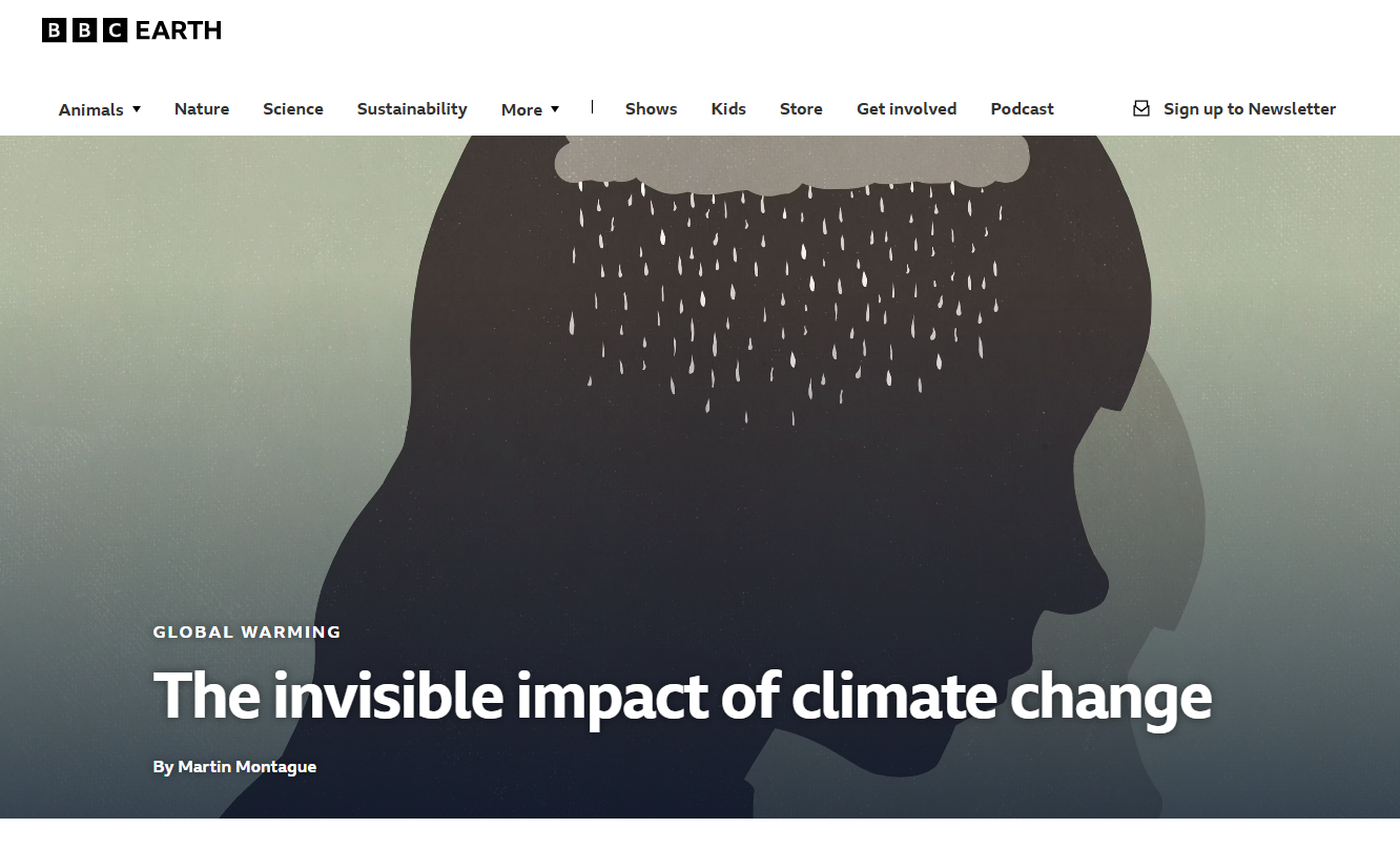 BBC Earth가 최근 보도한 ‘보이지 않는 기후변화의 영향(The invisible impact of climate change)’에 따르면, 기후위기로 인한 불안·우울증·외상후스트레스장애(PTSD)는 전 세계적으로 늘고 있다.