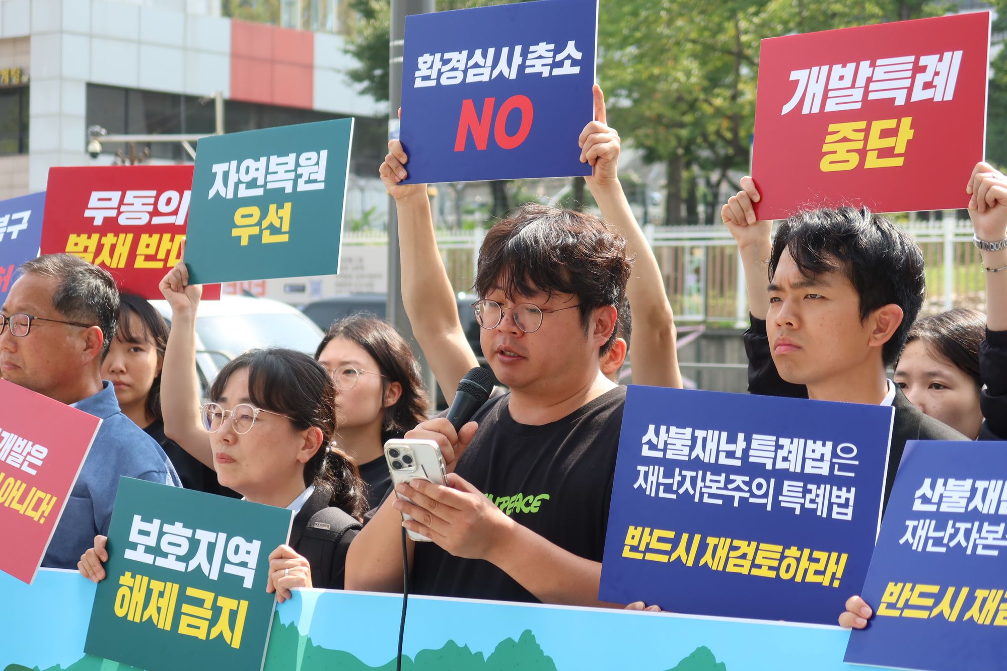 김수동 안동환경운동연합 대표는 “이번 법은 재난 치유가 아니라 ‘이 참에 개발하자’는 재난 자본주의의 전형”이라며 “기후위기 시대에 탄소흡수원인 산림을 파괴한다면 더 큰 재난을 불러올 것”이라고 경고했다.