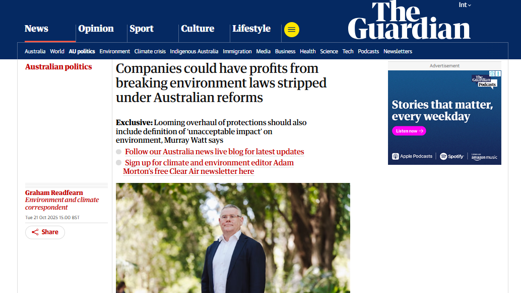 머리 왓(Murray Watt) 호주 환경부 장관은 22일 “환경을 훼손해 돈을 버는 기업의 시대는 끝나야 한다”며 새로운 환경법 개정안을 공개했다.