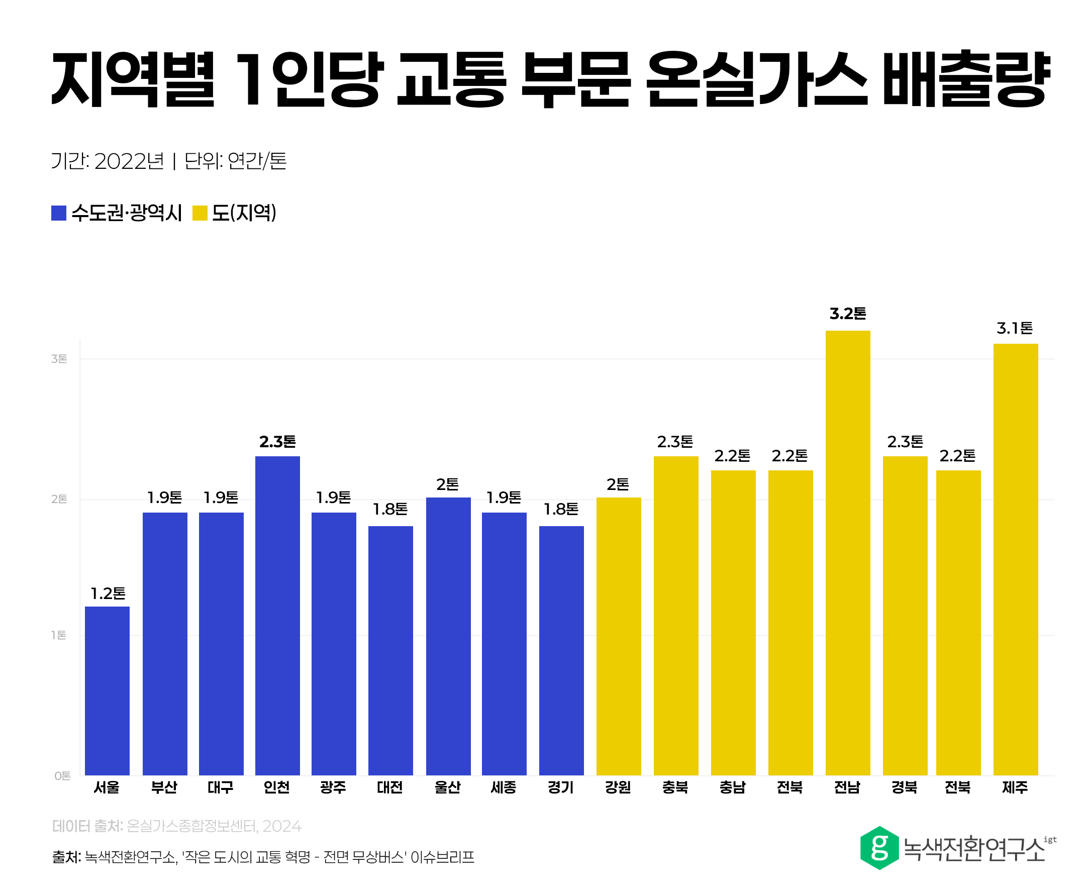 녹색전환연구소는 18일 발표한 이슈브리프 '작은 도시의 교통 혁명, 전면 무상버스'에서 “비수도권 지역 1인당 교통 부문 배출량이 서울의 두 배에 달한다”며 “무상버스 확대가 승용차 의존 억제와 온실가스 감축에 효과적일 수 있다”고 밝혔다.