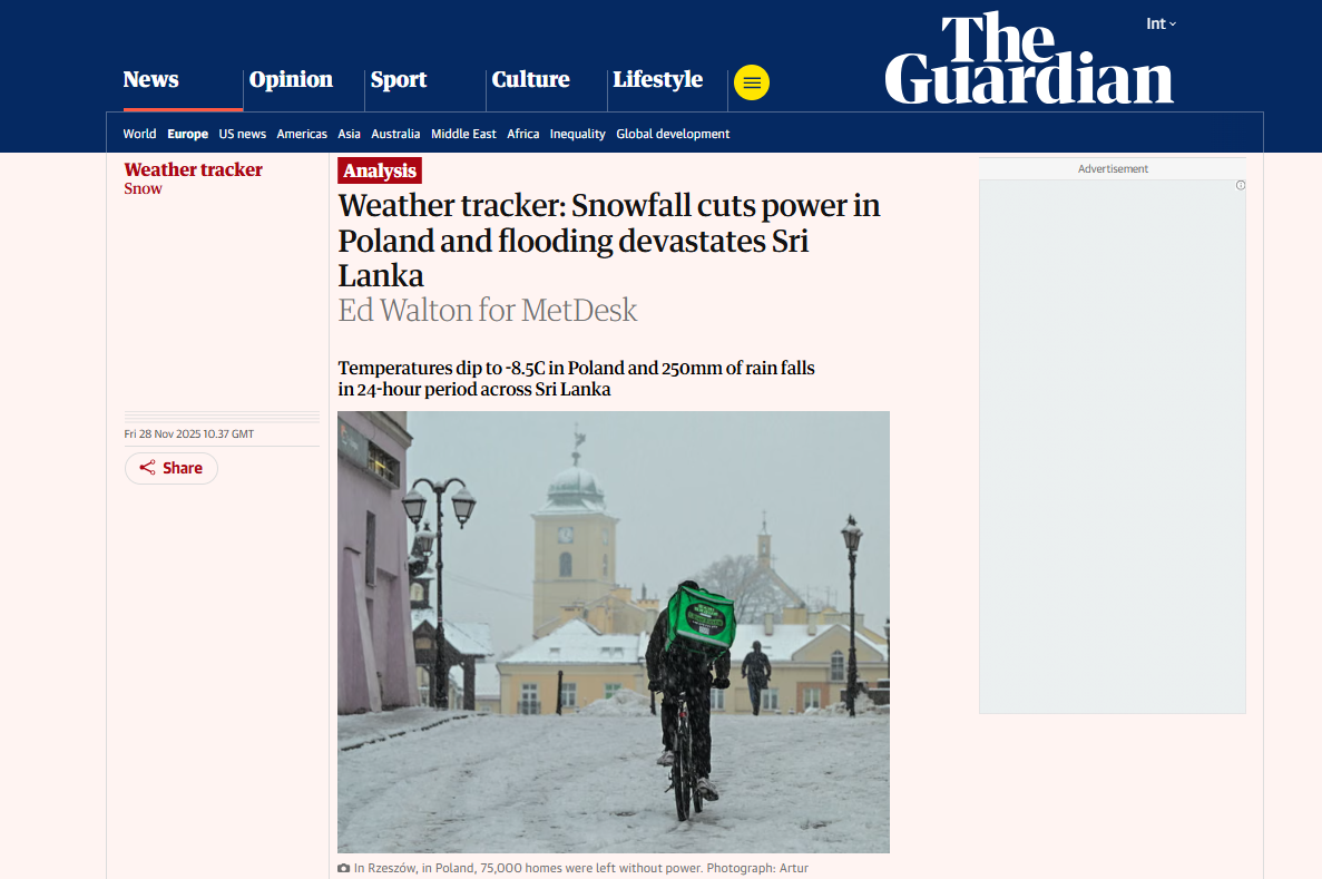 가디언은 28일(현지시간) “폴란드는 폭설로 7만5천여 가구가 정전을 겪었고, 스리랑카에서는 하루 250mm가 넘는 폭우가 쏟아지며 수십 명이 숨졌다”고 전했다.