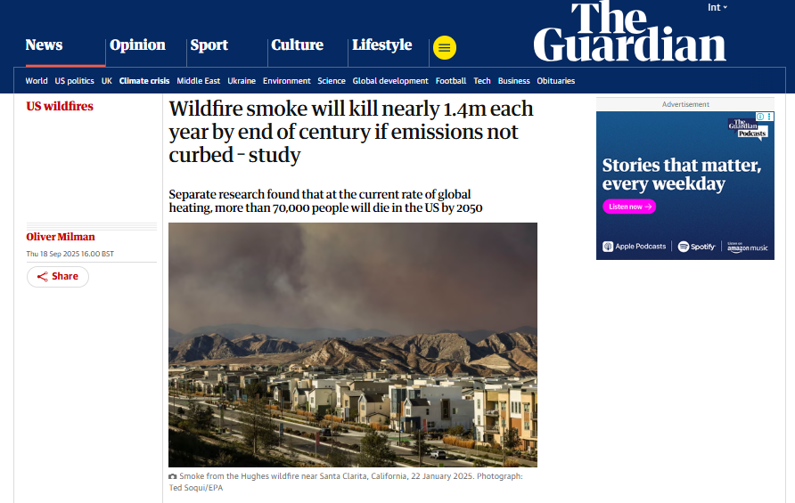 산불 연기에는 초미세먼지(PM2.5)와 독성 화학물질이 포함돼 있어 심혈관 질환과 호흡기 질환을 악화시키고, 어린이와 노약자의 건강을 위협한다. 이번 연구는 “현재 추세대로라면 2050년까지도 피해가 크게 늘어나며, 장기적으로는 매년 최대 140만 명이 목숨을 잃을 수 있다”고 경고했다.