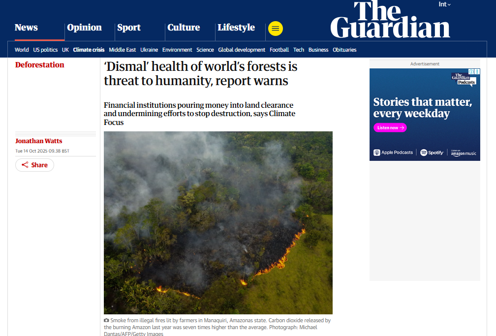 영국 일간지 더 가디언은 14일(현지시간) 국제 보고서를 인용해 “지구의 숲이 빠르게 쇠퇴하고 있으며, 이는 인간의 삶과 기후 안정성에 심각한 영향을 미치고 있다”고 보도했다.