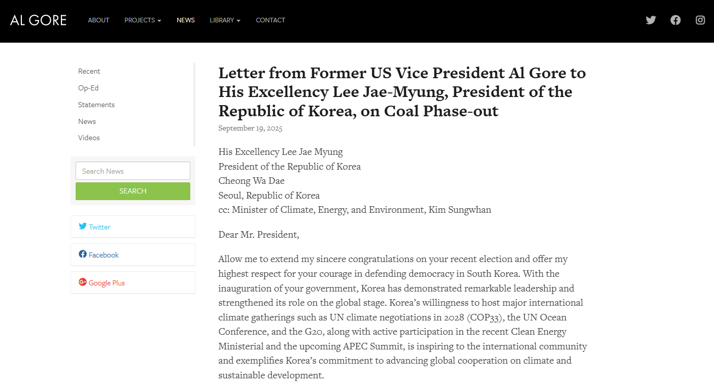 고어 전 부통령의 서한은 한국 정부가 국제무대에서 탈석탄 의지를 분명히 밝히고, 실질적 로드맵을 마련할 마지막 기회라는 점을 일깨운다.