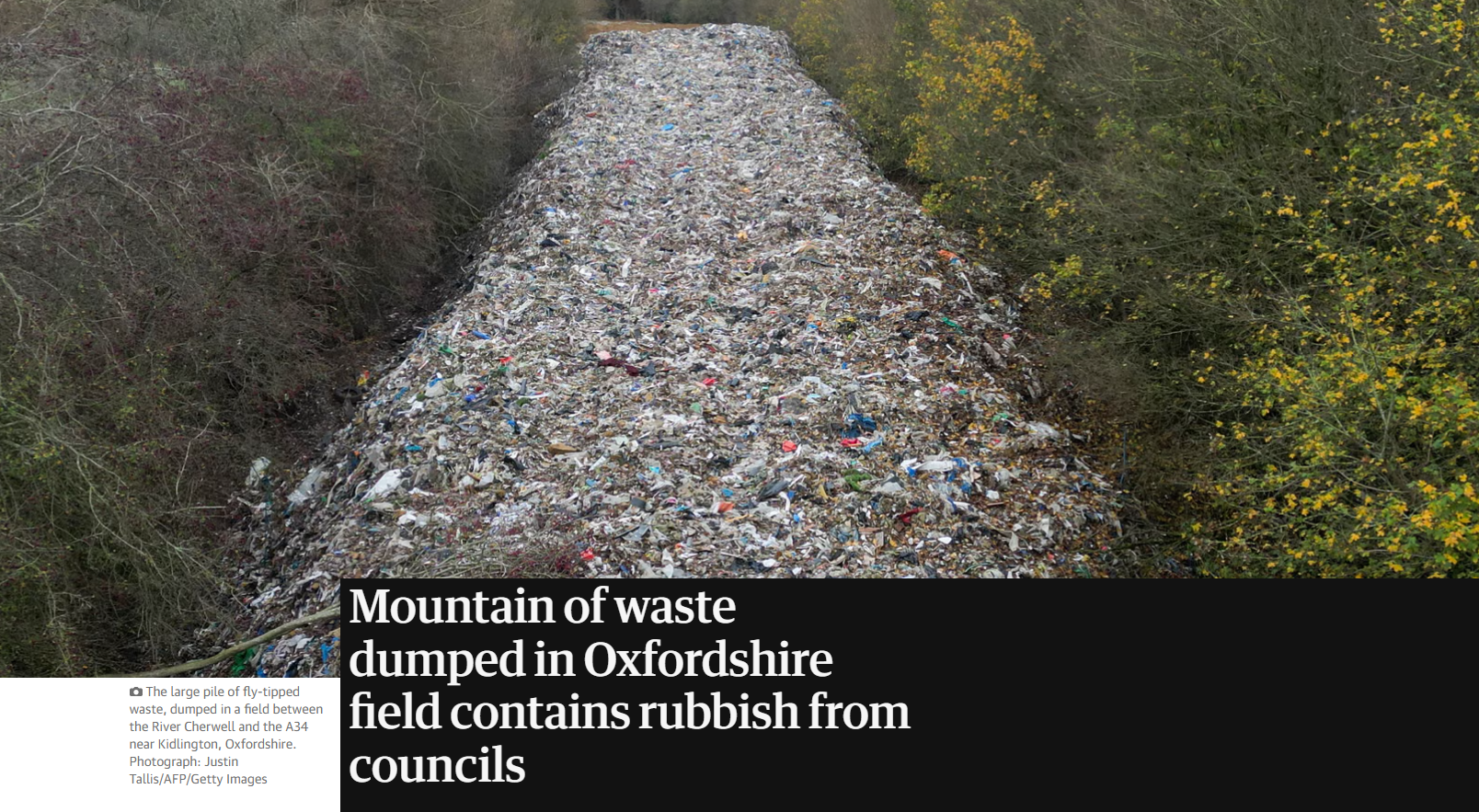 영국 잉글랜드 옥스퍼드셔의 한 들판에서 길이 150m, 높이 최대 6m에 이르는 대규모 불법 폐기물 더미가 발견되면서 영국 내 폐기물 관리 체계가 뿌리째 흔들리고 있다.